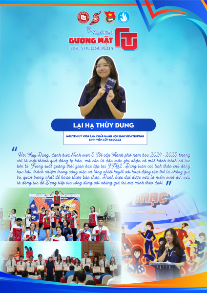 54Đồng chí Lại Hạ Thùy Dung - Nguyên Ủy viên Ban Chấp hành Hội Sinh viên Việt Nam Cơ sở II, Sinh viên lớp K62CLC5, ngành đào tạo Kinh tế đối ngoại, Trường Đại học Ngoại thương Cơ sở II tại TP. Hồ Chí Minh. Trong năm học 2024–2025, Thùy Dung vinh dự đạt danh hiệu “Sinh viên 5 tốt” cấp Thành phố. Trong suốt quá trình học tập và rèn luyện tại FTUHCMC, Thùy Dung luôn coi tinh thần chủ động học hỏi, ý thức trách nhiệm trong công việc và lòng nhiệt huyết với các hoạt động tập thể là những giá trị cốt lõi của bản thân. Danh hiệu “Sinh viên 5 tốt” không chỉ là niềm tự hào mà còn là động lực để Thùy Dung tiếp tục nỗ lực, sống đúng với những giá trị đã lựa chọn và không ngừng hoàn thiện chính mình.