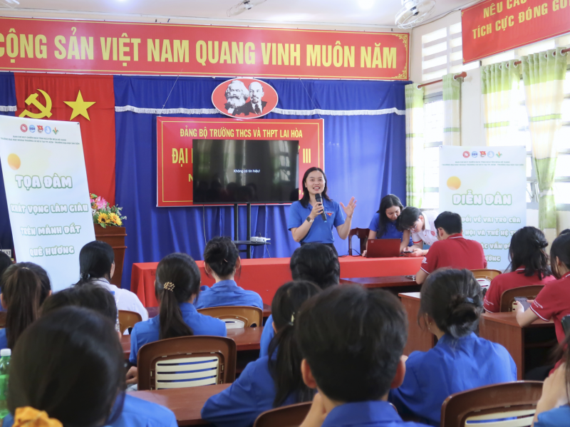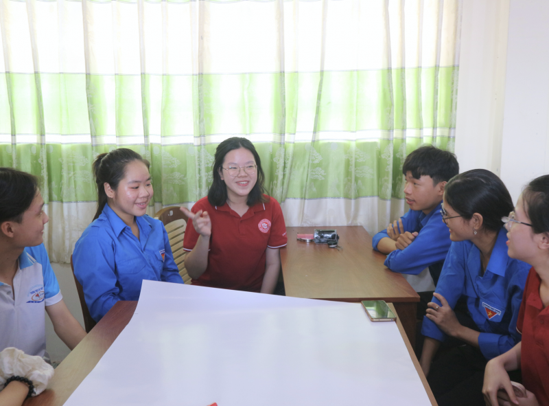 Các chiến sĩ Mùa hè xanh 2025 tham gia buổi tọa đàm “Khát vọng làm giàu trên mảnh đất quê hương”. Tại đây, các bạn trẻ cùng trao đổi về biến đổi khí hậu, xâm nhập mặn, vai trò của thanh niên trong bảo vệ môi trường, cũng như chia sẻ sáng kiến và cam kết vì một tương lai xanh, bền vững