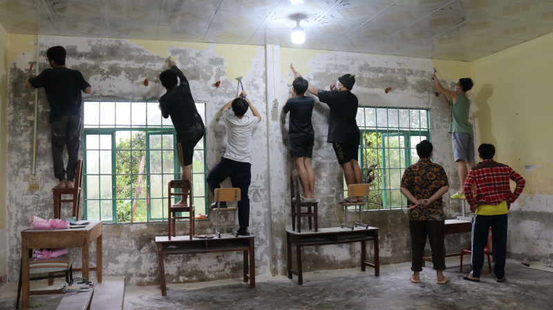 Dù công việc nhiều bụi và khá tốn sức, không khí làm việc vẫn luôn vui vẻ và nhịp nhàng. Nhờ sự tỉ mỉ, kiên trì và tinh thần phối hợp của tất cả mọi người, những bức tường cũ kỹ đã được làm sạch, làm phẳng, sẵn sàng cho lớp sơn mới của ngày hôm sau.