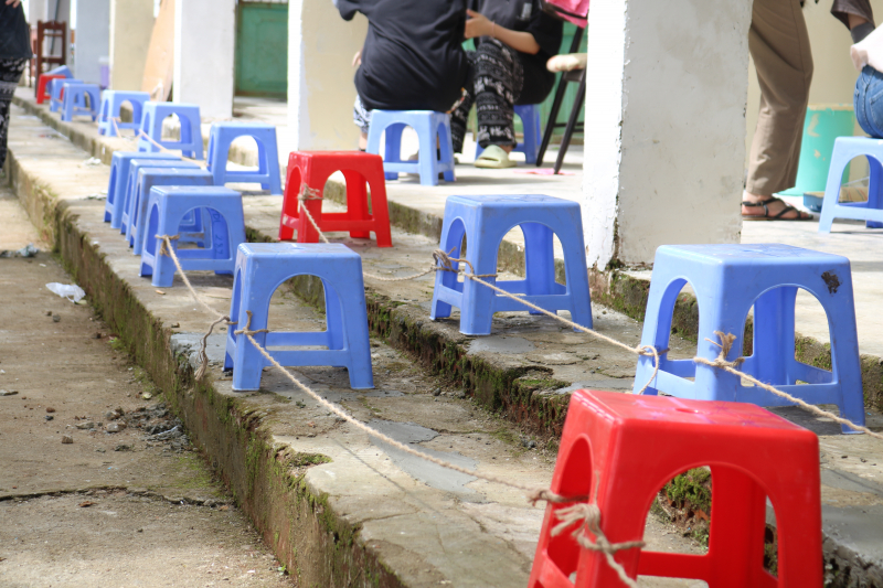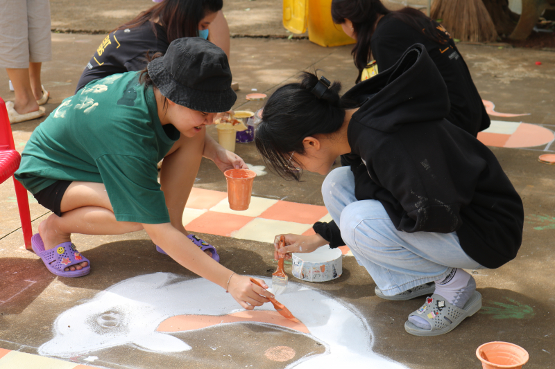 Cùng thời điểm đó, một nhóm khác bắt tay vào vẽ sân chơi cho các em nhỏ. Công việc được chia đều: người đo đạc kích thước, người kẻ nét, người tô màu; mỗi người một phần nhưng cùng hướng đến một mục tiêu chung. Những trò chơi quen thuộc như “ô ăn quan”, “nhảy lò cò”, cùng các họa tiết trang trí đáng yêu gợi nhớ về tuổi thơ, lần lượt xuất hiện trên nền sân cũ kỹ.