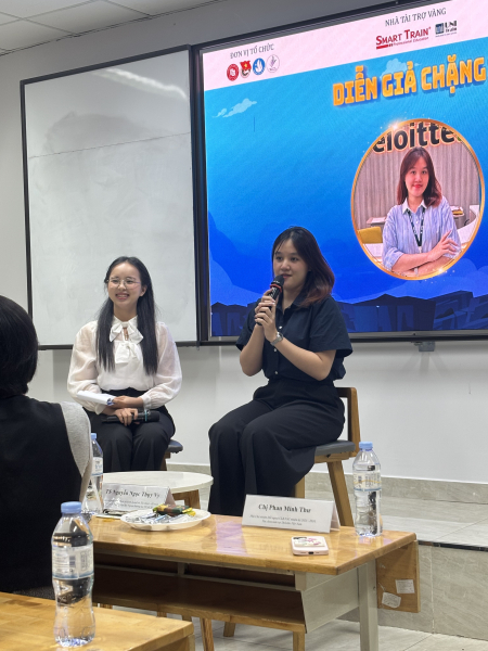Diễn giả Tiến sĩ Nguyễn Ngọc Thụy Vy – Giảng viên Bộ môn Quản trị Kinh doanh và Tài chính – Kế toán, Cơ sở II Trường Đại học Ngoại thương tại TP. HCM, Cố vấn Câu lạc bộ Kế toán – Kiểm toán (FAC) và Diễn giả Phạm Nguyễn Thị Ngọc Châu – Phó Giám đốc Đối ngoại & Giải pháp Khách hàng, Học viện SmartTrain (Speaker Dr. Nguyễn Ngọc Thụy Vy – Lecturer of the Business Administration and Finance–Accounting Division at Foreign Trade University – HCMC Campus and Advisor of the Accounting & Auditing Club (FAC), and Speaker Phạm Nguyễn Thị Ngọc Châu – Deputy Director of External Relations & Customer Solutions at SmartTrain Academy)