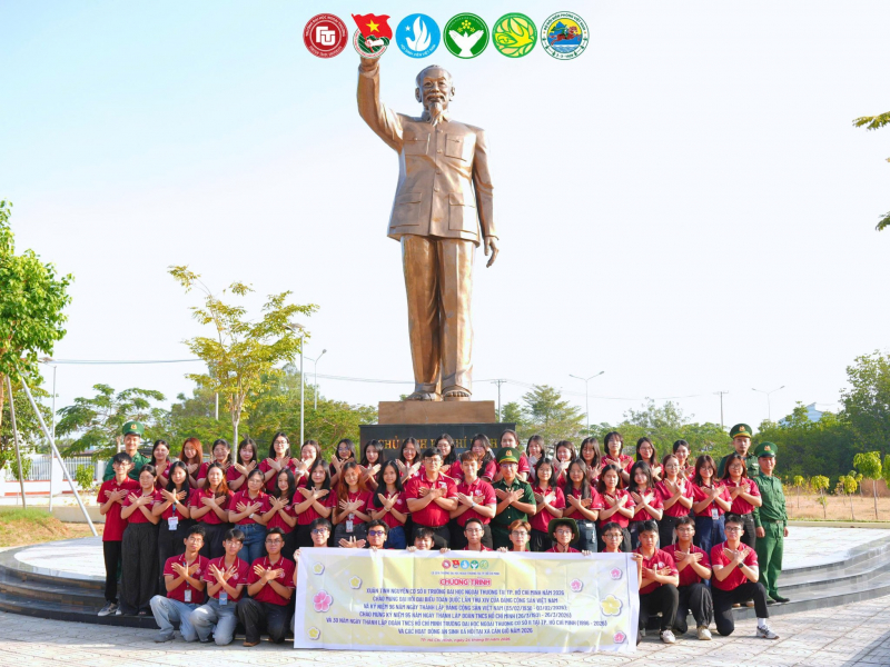 Các chiến sĩ chiến dịch Xuân Tình nguyện năm 2026 chụp ảnh lưu niệm dưới tượng đài Chủ tịch Hồ Chí Minh