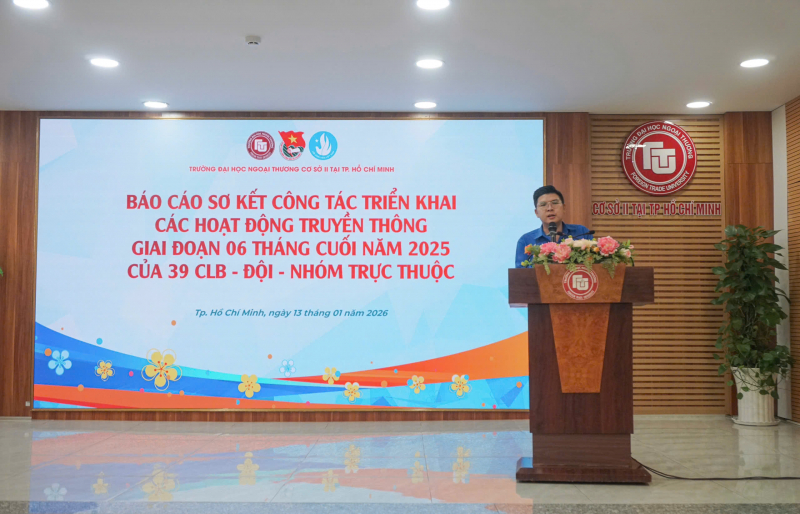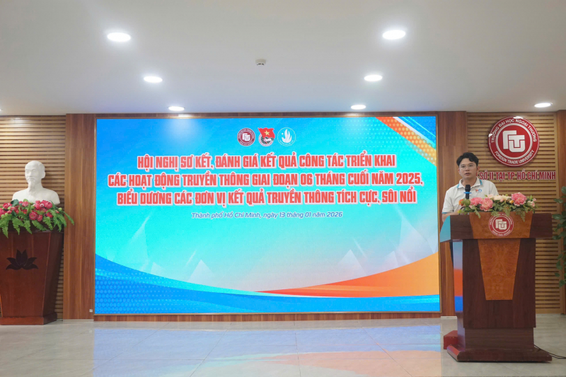 Tại Hội nghị, đồng chí Nguyễn Trần Minh Khôi - Phó Bí thư Đoàn trường đã trình bày báo cáo chi tiết, toàn diện về tình hình triển khai hoạt động truyền thông trong 06 tháng cuối năm 2025, phân tích các kết quả nổi bật, số liệu tiếp cận - tương tác, mức độ đồng bộ hình ảnh, thông điệp truyền thông giữa Đoàn trường, Hội Sinh viên và các CLB/Đội/Nhóm/Cộng đồng trực thuộc; đồng thời chỉ rõ những tồn tại, hạn chế cần khắc phục trong thời gian tới.