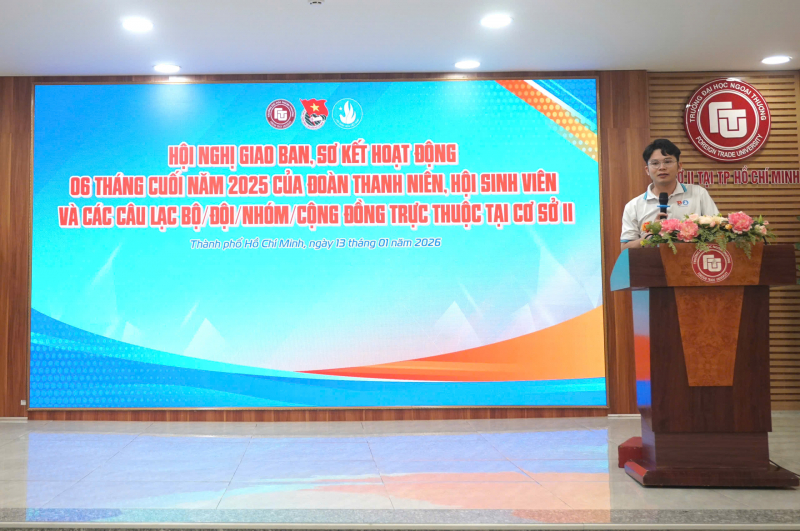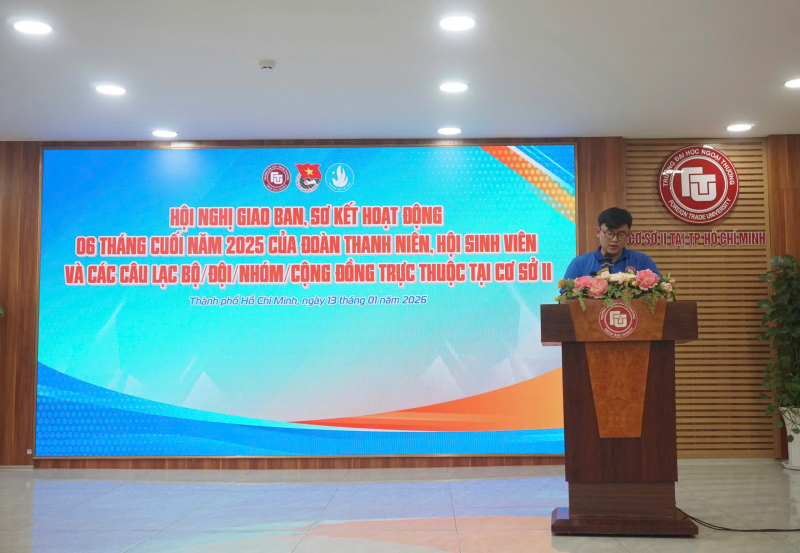 Nhằm đánh giá toàn diện kết quả triển khai các mặt công tác; nhìn nhận những điểm mạnh, hạn chế; đồng thời thống nhất định hướng, giải pháp nâng cao chất lượng hoạt động Đoàn – Hội và các Câu lạc bộ/Đội/Nhóm/Cộng đồng trực thuộc trong thời gian tới. Đoàn Thanh niên – Hội Sinh viên Cơ sở II Trường Đại học Ngoại thương tại TP. HCM tổ chức Hội nghị giao ban, sơ kết hoạt động 06 tháng cuối năm 2025.