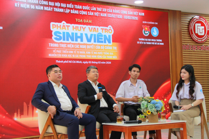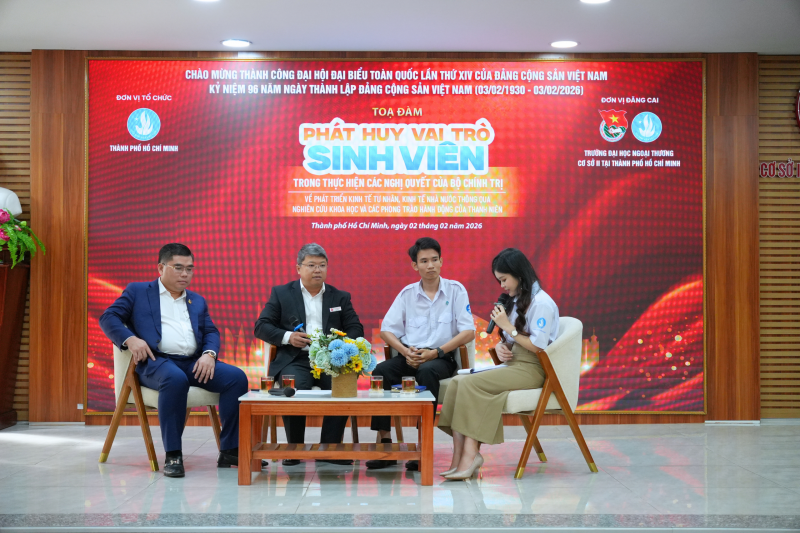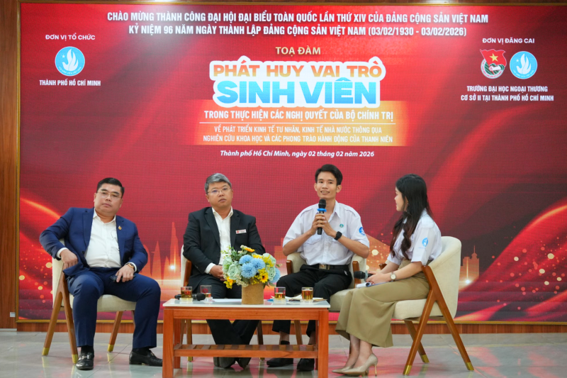 117 Thiết thực chào mừng thành công Đại hội đại biểu toàn quốc lần thứ XIV của Đảng Cộng sản Việt Nam, kỷ niệm 96 năm ngày thành lập Đảng Cộng sản Việt Nam (03/02/1930 - 03/02/2026). Chiều ngày 02/02/2026, tại Trường Đại học Ngoại thương Cơ sở II tại TP. Hồ Chí Minh, Tọa đàm "Phát huy vai trò của sinh viên trong triển khai các Nghị quyết của Bộ Chính trị về kinh tế tư nhân, kinh tế nhà nước thông qua nghiên cứu khoa học và các phong trào hành động của thanh niên" hưởng ứng tuần lễ cao điểm "Sinh viên Thành phố Hồ Chí Minh tiến theo cờ Đảng" đã được tổ chức trong không khí nghiêm túc, cởi mở và giàu giá trị học thuật. Chương trình nhằm tuyên truyền, quán triệt các Nghị quyết của Bộ Chính trị về phát triển kinh tế nhà nước, kinh tế tư nhân trong bối cảnh phát triển mới; đồng thời khơi dậy tinh thần trách nhiệm, vai trò tiên phong của sinh viên, đặc biệt là đảng viên sinh viên trong việc đưa Nghị quyết vào thực tiễn học tập, nghiên cứu và hành động.