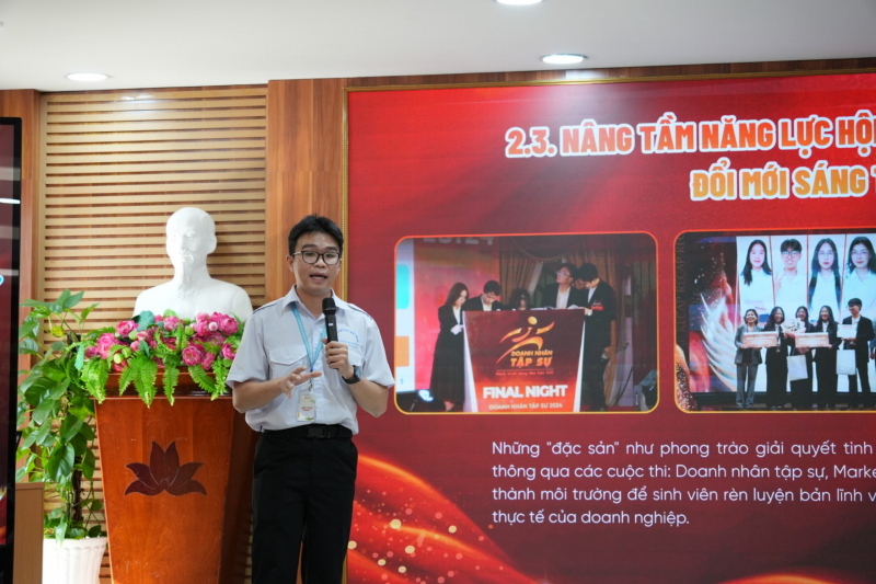 Tham luận thứ nhất với chủ đề “Vai trò của sinh viên các ngành kinh tế, kinh doanh trước những cơ hội và thách thức trong bối cảnh phát triển mới của đất nước”, do Chi bộ Sinh viên Cơ sở II và Hội Sinh viên Trường Đại học Ngoại thương Cơ sở II trình bày, đã làm rõ bối cảnh phát triển mới của nền kinh tế Việt Nam trong giai đoạn hội nhập sâu rộng và chuyển đổi mô hình tăng trưởng. Tham luận nhấn mạnh yêu cầu đặt ra đối với sinh viên khối ngành kinh tế – kinh doanh không chỉ dừng lại ở việc tiếp thu kiến thức lý thuyết, mà cần chủ động rèn luyện tư duy phân tích chính sách, năng lực nghiên cứu khoa học và khả năng vận dụng kiến thức chuyên môn để giải quyết các vấn đề thực tiễn. Qua đó, sinh viên được định hướng trở thành nguồn nhân lực chất lượng cao, có bản lĩnh chính trị, trách nhiệm xã hội và khát vọng cống hiến cho sự phát triển bền vững của đất nước.