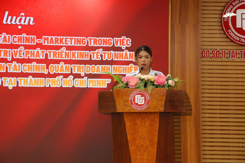 Tham luận thứ hai với chủ đề “Vai trò của sinh viên khối ngành Tài chính – Ngân hàng trong việc đưa Nghị quyết của Bộ Chính trị về phát triển kinh tế nhà nước, kinh tế tư nhân vào thực tiễn thông qua hoạt động ngân hàng, tài chính và đầu tư công tại Thành phố Hồ Chí Minh”, do Hội Sinh viên Trường Đại học Ngân hàng TP. Hồ Chí Minh trình bày, đã tiếp cận vấn đề từ góc nhìn chuyên sâu của lĩnh vực tài chính – ngân hàng. Tham luận phân tích vai trò của hệ thống tài chính trong việc hiện thực hóa các chủ trương, chính sách lớn của Đảng; đồng thời làm rõ trách nhiệm của sinh viên trong việc nâng cao năng lực chuyên môn, nghiên cứu thực tiễn thị trường tài chính, ngân hàng, đầu tư công để góp phần đưa Nghị quyết vào đời sống kinh tế – xã hội của Thành phố Hồ Chí Minh – trung tâm kinh tế lớn của cả nước.