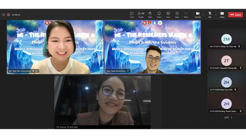 TS Vương Thị Bích Ngà và Anh Trần Anh Tùng – Cựu sinh viên K53 – Logistics Leader tại P&G – đã có những phần giao lưu, chia sẻ và giải đáp sôi nổi cùng sinh viên trong buổi Định hướng Phát triển Nghề nghiệp theo Ngành Kinh doanh Quốc tế (Dr Vuong Thi Bich Nga and Mr. Tran Anh Tung – FTU alumna from Cohort 53, Logistics Leader at P&G, engaged in insightful discussions and interactive Q&A sessions with students during the Career Development Orientation Session for International Business Majors).
